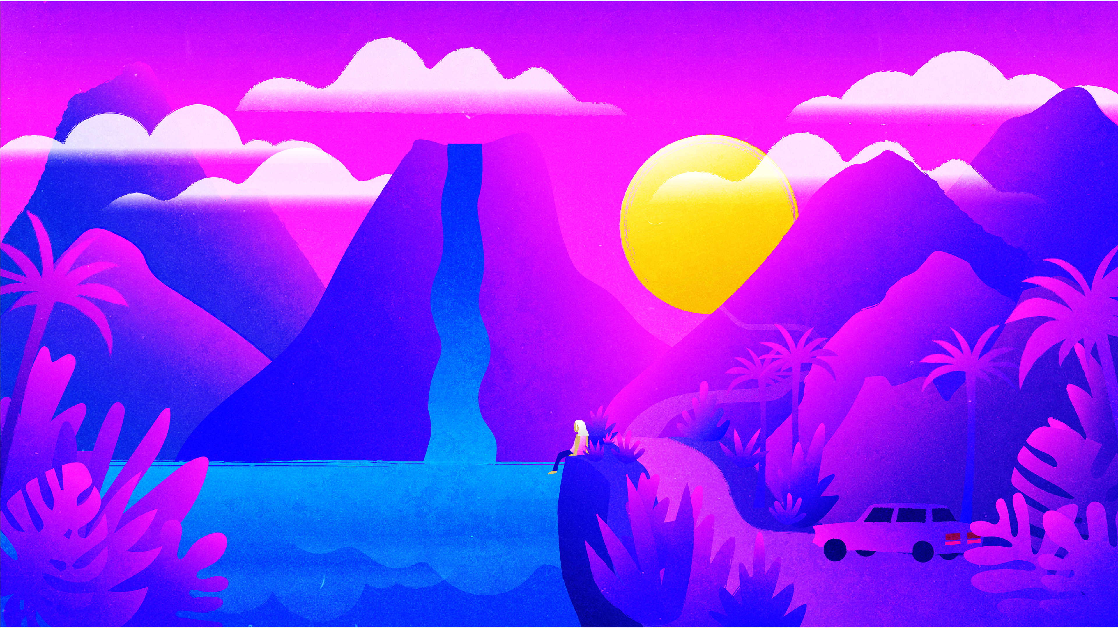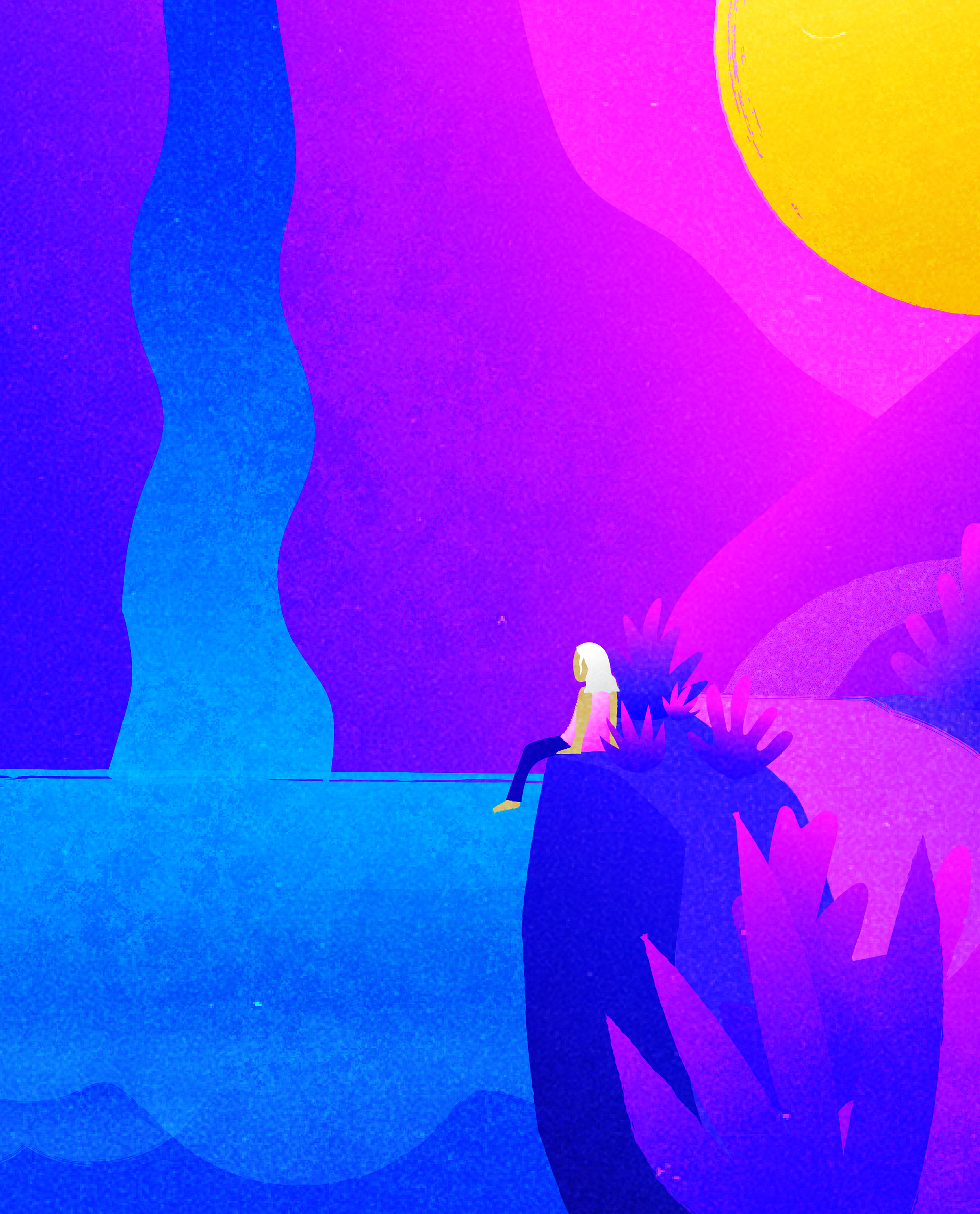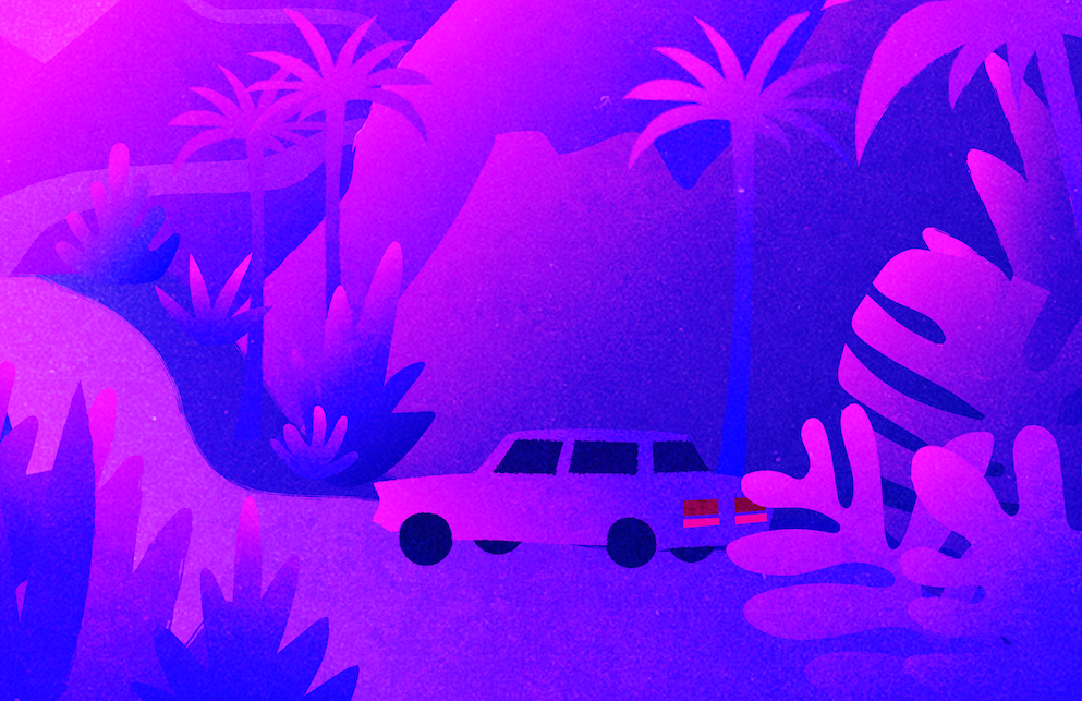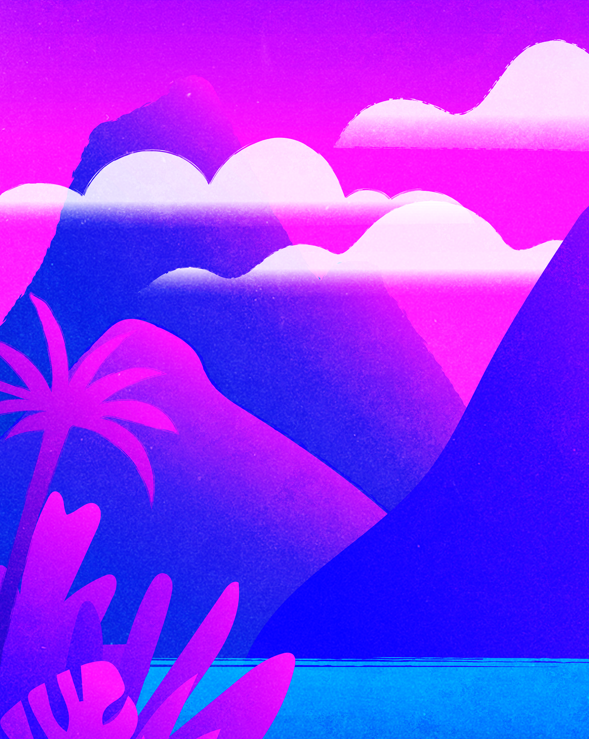 This project was created for the course Studio Concepts, following the prompt of environment/nature/spirituality/ritual. Given the choice of following any of the four prompts, I chose to combine all four by representing a recurring dream I experience almost every night. In the dream, I'm always urged to drive to a specific, beautiful location. I focused on using similar colors that blended into each other like the memories of our dreams upon waking, and grainy textures and noise that gave similar feelings. After creating the illustration, I brought the dream to life as a short animation in After Effects. The clip is a representation of waking in part of the dream, complete with blurring and haziness that gives a dreamlike feeling. The breeze flows and the foliage sways in a moment of peace. The clip blurs out and ends, only to keep repeating as it does every night in my head. For critique, the video was played projected upon a white wall in a completely dark room and set upon an infinite loop.
